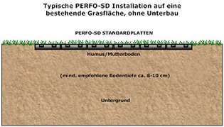 | Für den Einbau der PERFO-Produkte gibt es verschiedene Vorgehensweisen, bei deren Auswahl die Art der Anwendung sowie die gegebenen Bodenverhältnisse berücksichtigt werden müssen. In vielen Fällen ist es möglich PERFO-Bodenplatten direkt in den begrünten Boden zu verlegen. |